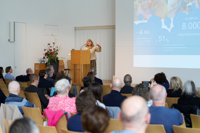 Dass die Seltenen gar nicht so selten sind, machte Prof. Martin Wabitsch an zwei Beispielen deutlich, die Geske Wehr besonders in Erinnerung geblieben sind: „Es gibt vier Millionen Betroffene in Deutschland. Das heißt für alle, die Kinder haben: Statistisch gesehen ist ein Kind pro Klasse betroffen. Und für alle, die keine Kinder haben: Bei einem Fußballspiel stehen statistisch 1 bis 2 Betroffene auf dem Rasen.