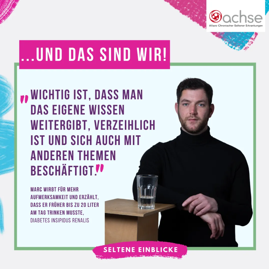 Ich habe die Seltene Erkrankung Diabetes insipidus renalis, ein Gendefekt, mit dem ich seit meiner Geburt lebe. Im Alltag ist die Erkrankung mit viel logistischem Aufwand, Durst und Erschöpfung verbunden. Außerdem ist es anstrengend, dass so wenig Menschen die Erkrankung kennen und ich immer wieder sehr viel erklären muss. Meistens versuche ich es dann kurz zu halten - Betroffene haben immer Durst und trinken bis zu 20 Liter Wasser am Tag. Klingt skurril, ist aber so.