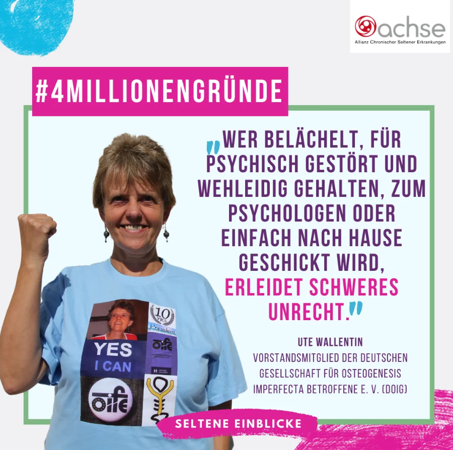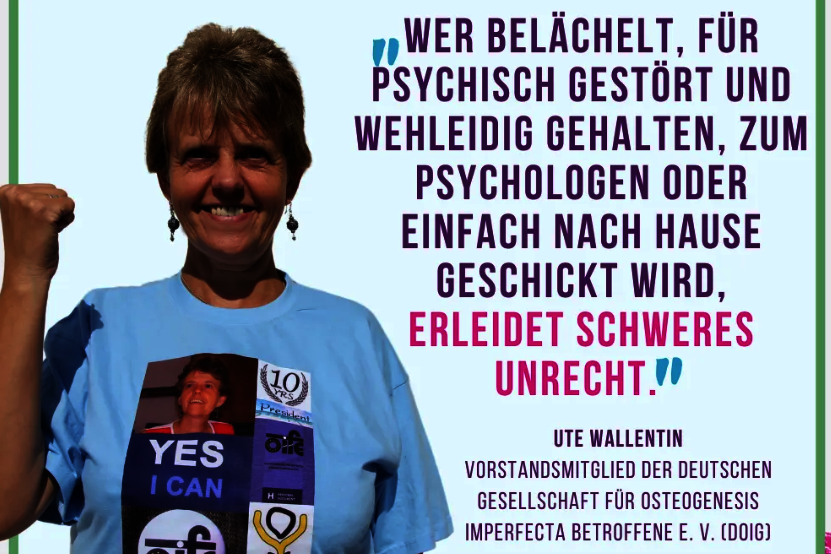 Ein Problem, das auch viele Erwachsene betrifft. Ich bin vielen OI-Erwachsenen begegnet, denen, zu ihrem großen Nachteil, nicht geglaubt wurde. Ihre Schmerzen wurden nicht anerkannt, die nicht sichtbaren, aber oft beträchtlichen Einschränkungen nicht ernst genommen. Selbst eine kleinwüchsige Medizinerin war einmal dabei, die erst mit 56 Jahren die richtige Diagnose und dann Behandlung erhielt. Bis dahin hatten alle und sie selbst angenommen, sie habe nur einen Vitamin-D-Mangel.