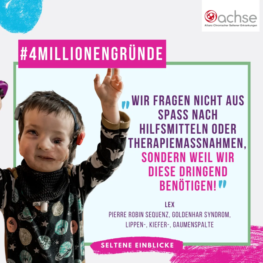 Kein gesundes Kind zur Welt bringen ist für Eltern hart, aber sie haben sich aufklären lassen und waren beruhigt. Durch die Kanüle habe ich so gut wie keine Stimme – ich kann aber sehr gut Grimassen schneiden. Ein wenig sprechen und lautieren kann ich auch. Das hilft mir im Alltag sehr weiter. Ansonsten unterhalte ich mich mit meiner Familie in Gebärdensprache – das macht mir auch sehr viel Spaß. Zusätzlichen Sauerstoff brauche ich nur noch, wenn ich krank bin. Die Trachealkanüle werde ich behalten, bis alle meine Milchzähne rausgefallen sind. Danach ist geplant, in einer Operation mein linkes fehlendes Kiefergelenk aufzubauen. Auch ohne diese habe ich bis heute bereits zehn Operationen und mehrere genetische Untersuchungen hinter mir. Alle negativ – auch die anschließende Exom-Sequenzierung. Ich bin somit „eine Laune der Natur", wie die Ärzte es ausdrückten.